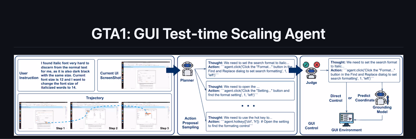 During task execution, GTA1 doesn’t commit to a single plan; instead, it samples multiple candidate action-sequences and evaluates them on the fly with another model acting as a “judge,” choosing the best option step-by-step. This clever test-time planning diversity makes it far more robust to errors (if one plan would have gotten stuck, an alternate path can be taken). It also uses reinforcement learning via GRPO to train the grounding model to click more accurately.